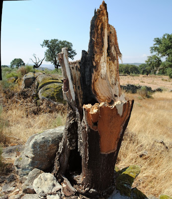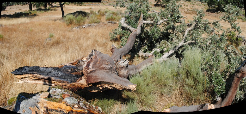 Com a ventania dos passados dia 1 e 2 de Setembro, um dos velhos sobreiros da reserva da Faia Brava, não aguentou e partiu-se a meio do que restava do seu tronco, deitando a verdejante copa toda ao chão. Esta é a sina de muitos sobreiros seculares da Faia Brava que acabam por não suportar os sucessivos descortiçamentos deficientes, fogos, secas e as consequentes doenças, que lhes encurtam a consideravelmente a esperança de vida. A esperança em mudar está no melhoramento da gestão agro-silvopastroril, na formação dos descortiçadores, na redução da frequência dos fogos, no fundo a esperança está no que pode trazer a figura de  ZIF (Zona de Intervenção Florestal) do Vale do Côa. Fazemos votos que o Estado apoie mais as ZIFs, nomeadamente esta que abrange nada mais que a maior mancha de sobreiros do distrito da Guarda.